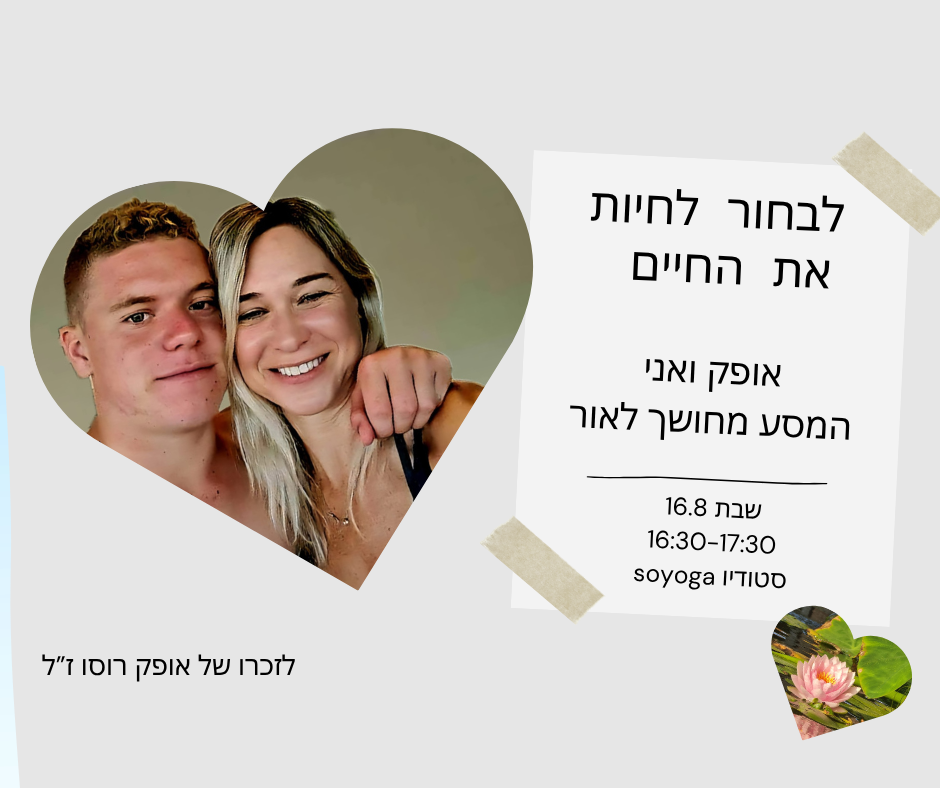 בתאריך 16.8 שבת בשעה 16:30 יתקיים בסטודיו מפגש בו אספר על המסע של אופק עד נפילתו כלוחם שייטת 13 בקיבוץ בארי ב 8.10.23 ועל ההתמודדות